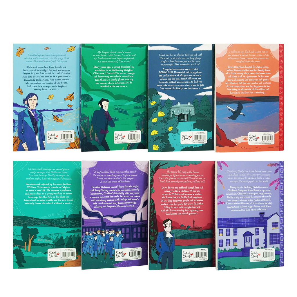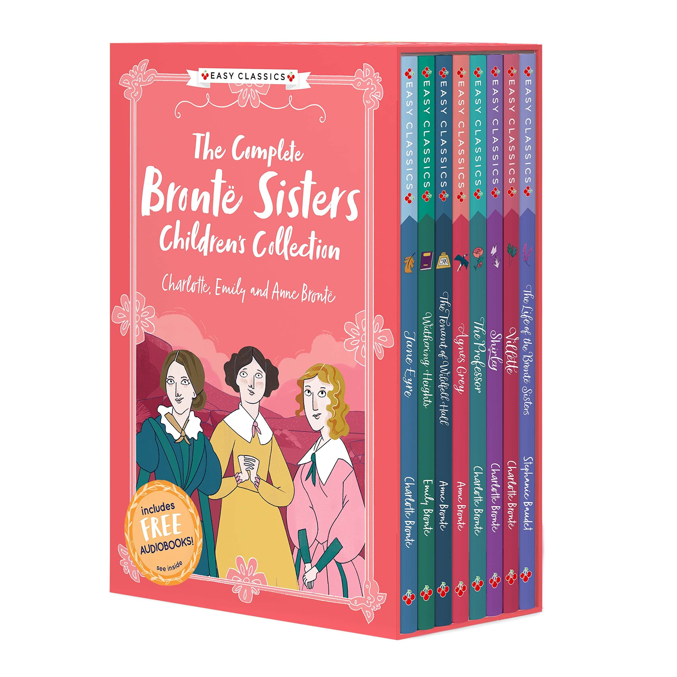 1. Jane Eyre2. Wuthering Heights3. The Tenant of Wildfell Hall4. Agnes Grey5. The Professor6. Shirley7. Villette8. The Life of the Bronte Sisters